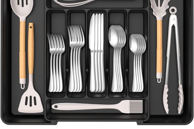 The ukeetap Extra Large Expandable Silverware Organizer provides a flexible and structured solution for organizing kitchen drawers. With an adjustable design, extra large capacity, BPA-free food-safe materials, and clearly defined compartments, it supports efficient storage for cutlery and utensils. The modern black finish and expandable layout make it suitable for a variety of kitchen styles and drawer sizes.